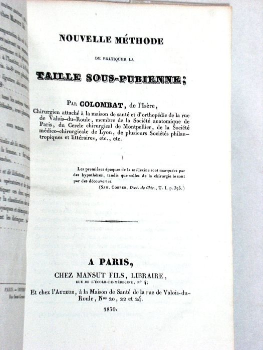 in-4. 28pp. Broché, couverture moderne protégée par du papier cristal. Très bon état. Edition Originale. Après avoir décrit les différentes méthodes en usage jusqu'alors, avec des références à Pierre Franco, Rousset, Heister, Lisfranc, Civiale, Dupuytren, etc., ce mémoire contient la description d'une manière inédite de pratiquer la cystotomie. Chirurgie. Urologie.