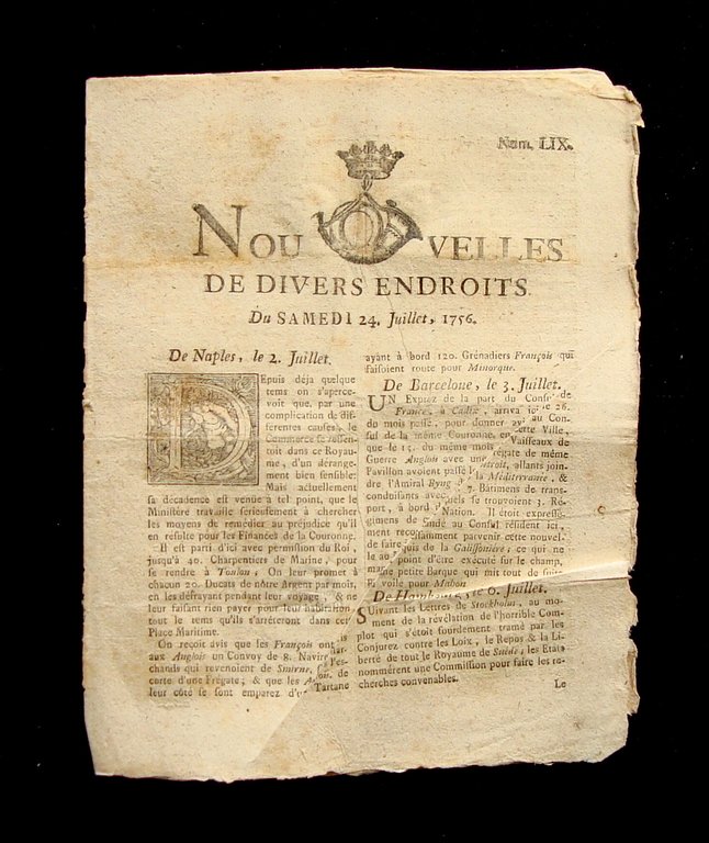 Periodico, Nouvelles de divers entroits N LIX Du Samedì 24 Juillet, 1756 s.d.t., 1756; cm 21x17, pp. n.n (4 + 2 supplemento); testo in francese su due colonne; bel fregio in alto e bel capolettera miniato. Condizioni di conservazione Esemplare in buono stato di conservazione con leggeri segni del tempo con piccole mancanze al dorso in quanto proveniente da vecchia raccolta di vari opuscoli rilegati insieme; pieghe di conservazione; parzialmente sciolto; leggere bruniture e qualche macchietta; margini con minuscoli strappetti dovuti al tipo di carta e qualche piccola mancanza; per condizioni vedi foto. SC03.D16537 blu
