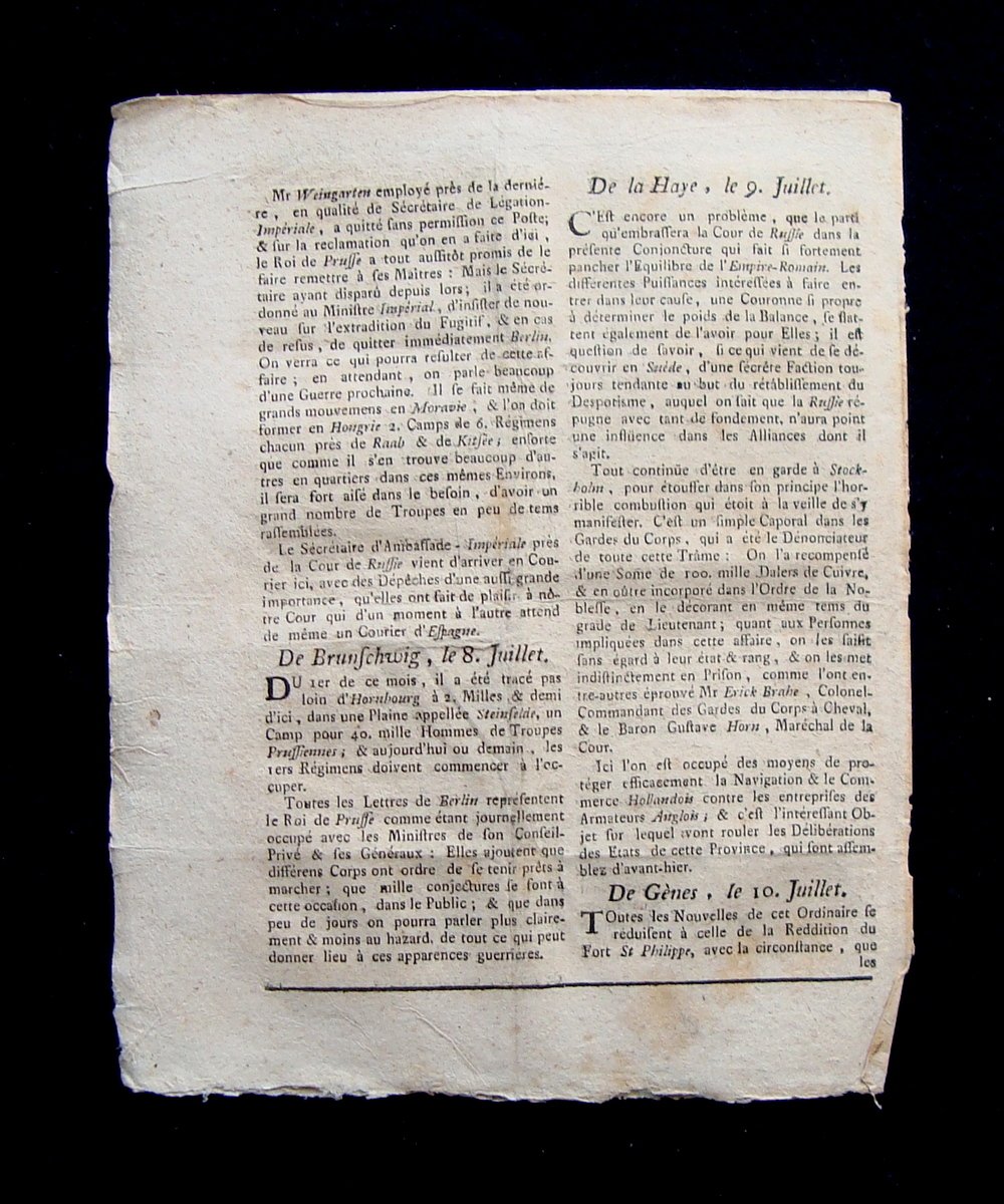 Periodico, Nouvelles de divers entroits N LVIII Du Mecredì 21 Juillet, 1756 s.d.t., 1756; cm 21x17, pp. n.n (4 + 2 supplemento); testo in francese su due colonne; bel fregio in alto e bel capolettera miniato. Condizioni di conservazione Esemplare in buono stato di conservazione con leggeri segni del tempo con piccole mancanze al dorso in quanto proveniente da vecchia raccolta di vari opuscoli rilegati insieme; pieghe di conservazione; parzialmente sciolto; leggere bruniture e qualche macchietta; margini con minuscoli strappetti dovuti al tipo di carta e qualche piccola mancanza; per condizioni vedi foto. SC03.D16539 blu