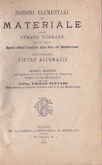 Nozioni elementari sul materiale delle strade ferrate ad uso degli Operai Allievi Fuochisti della Rete del Mediterraneo. Quarta edizione coll'aggiunta di due tavole litografate riveduta e corretta sulle precedenti per opera dell'ing. Emilio Zuccari LEGATO CON 'Lezioni di fisica, chimica e meccanica dettate secondo il Programma in vigore per le Scuole Operai Allievi Fuochisti Strade Ferrate del Mediterraneo. Terza edizione',