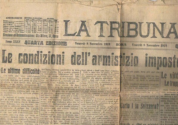 Numero del quotidiano La Tribuna del Venerdì 8 Novembre 1918 contenente le condizioni dell'armistizio imposto all'Austria.
