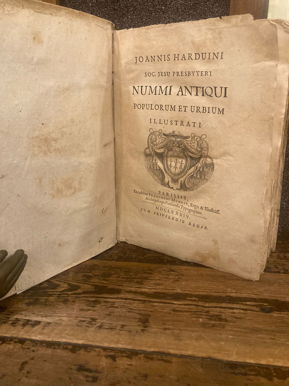 In-4° (284x205mm), pp. (54), 610, (1), cartonatura alla rustica coeva con titolo e fregio manoscritti anticamente al dorso. Al frontespizio, stemma calcografico all'Arcivescovo Charles Maurice Le Tellier, dedicatario dell'opera; il blasone del religioso è ripetuto sulla testatina incisa su rame dal Giffart che sormonta la dedicatoria, affiancato da putti, da un leone, da una figura femminile allegorica. Alla dedica fanno seguito un 'Index Caesarum, et Augustarum', un indice dei nomi dei magistrati, dei pretori, dei pontefici, un indice delle cose notabili. Aloni marginali alle prime 2 cc. e alle ultime 20 p. ca., nonché alle ultime cc. bianche, al contropiatto e al piatto posteriori; sparse bruniture e fioriture; nell'insieme, più che discreto esemplare a pieni margini. Edizione originale di questa trattazione sulle monete di Grecia e di Roma antica. L'Hardouin (Quimper, Bretagna,1646-Parigi, 1729), sacerdote gesuita, è noto ancora oggi per le sue teorie sul mondo classico estremamente bizzarre e destituite di fondamento per la loro paradossalità già all'epoca; egli credette che la maggior parte delle opere dell'antichità classica (ad eccezione dei poemi omerici, di Erodoto, di Cicerone, di Plinio il Vecchio, delle 'Georgiche' virgiliane, delle 'Satire' e delle 'Epistole' di Orazio) fossero falsi prodotti nel XIII secolo dai monaci benedettini. Bibliotecario del Collège Louis le Grand dal 1683, fu dapprima editore di classici (tra l'altro di una 'Naturalis Historia' pliniana ad usum Delphini), poi si volse prevalentemente agli studi numismatici. Nonostante l'assurdità delle sue teorie, ampi e di notevole valore furono i suoi apporti alla storia della numismatica. Brunet, VI, 29760. De Backer-Sommervogel, IV, 84-111. Manca al Cicognara, al Graesse e all'Olschki.