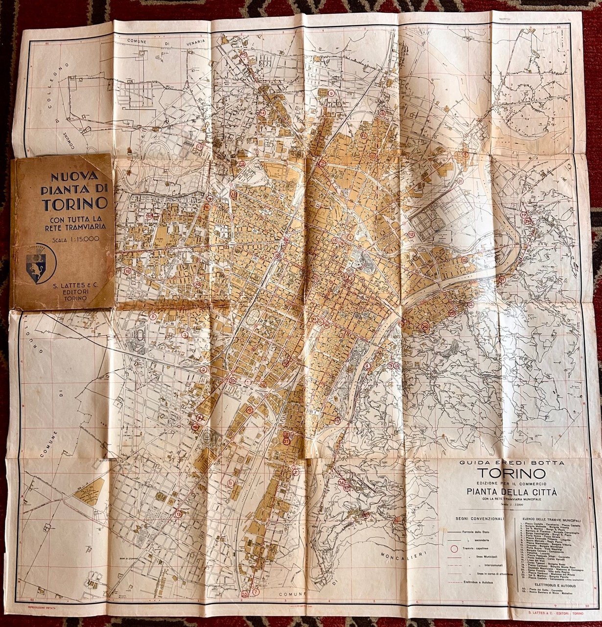 >Grande carta ripiegata ( 80 x 80 cm) conservata entro brossura editoriale con dorso ed angoli rinforzati (14,5 x 21,5 cm.). Nell'angolo inferiore destro, il titolo e la legenda con l'indicazione dei segni convenzionali e l'elenco delle tramvie municipali, elettrobus e autobus. Due piccoli taglietti nella piega inferiore, rinforzi al verso, qualche macchietta marrone.