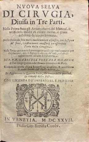 Nuova selva di cirugia, divisa in tre Parti. Nella prima sono gli Avvertimenti del Manual, & artificioso modo di curare molte, e gravi infirmità del corpo humano. Nella seconda sono molti medicamenti esquisiti, con le figure de’ ferri, o instrumenti necessarij per essercitare l’arte della Cirugia. Nella terza parimenti si contengono molti rari medicamenti per distillationi, con le figure in ultimo de’ vasi, e fornelli appartenenti all’arte distillatoria. Di nuovo in questa ultima impressione ampliato, & accresciuto di molti secreti dell’istesso Autore et aggiuntovi la quarta Parte, che tratta delle qualità, & rimedij della peste