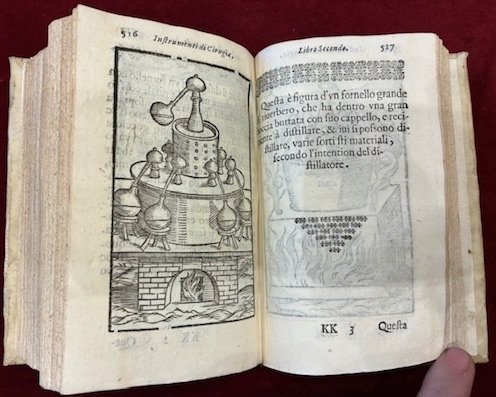 8vo (cm. 15,5), 16 cc.nn., 565 pp., 3 pp. bianche, 8 cc.nn., 86 pp. Due frontespizi, 73 xilografie a piena pagina raffiguranti strumenti chirurgici e alambicchi. Marca tipografica al frontespizio e stemma del dedicatario, il duca d’Urbino, al verso del primo frontespizio. Iniziali e fregi xilografici n.t. Legatura in pergamena antica. Lievi macchie su una decina di carte, peraltro esemplare in ottimo stato di conservazione. Rara quarta edizione accresciuta nella quale è aggiunta per la prima volta la quarta Parte che tratta della peste (l’originale è del 1596). L’autore (1543-1627), apprezzato chirurgo attivo a Milano nella seconda metà del ‘500, si distinse anche per una particolare tecnica d’intervento al cervello. Cfr. Krivatsy, 4029; Wellcome I, 2224.