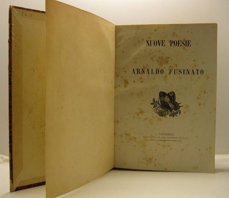In 4. Pp. (4) + 168 con 8 incisioni litografiche a p. p. f. t. M. tl. coeva con fregi e scritte in oro al d. Marmorizzature sparse Ed. originale. Arnaldo Fusinato (Schio, 25 novembre 1817 - Roma, 28 dicembre 1888) fu poeta e patriota . Parenti, Rarita' bibl., I , 13 - 26.