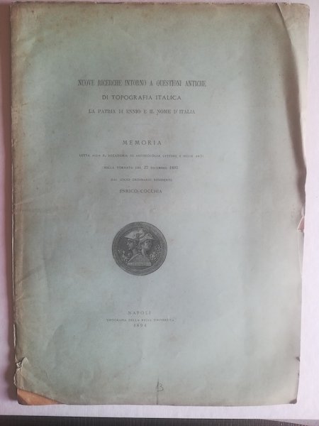 In 4 (cm 23 x 31,5), pp. 15 + (1b). Dedica autografa la frontespizio. Leggera pieghetta al margine esterno dei fogli. Brossura editoriale con lievi danni riparati. Estratto editoriale dagli Atti dell'Accademia di Archeologia, Lettere e Belle Arti. Saggio che affronta due questioni: un'indagine sulla patria di Ennio, sulla scorta di alcune osservazioni critiche di Ettore Pais, e l'origine del nome Italia con riferimento particolare a quale regione della Penisola ne circoscrivesse, all'inizio, la delimitazione geografica e onomastica.