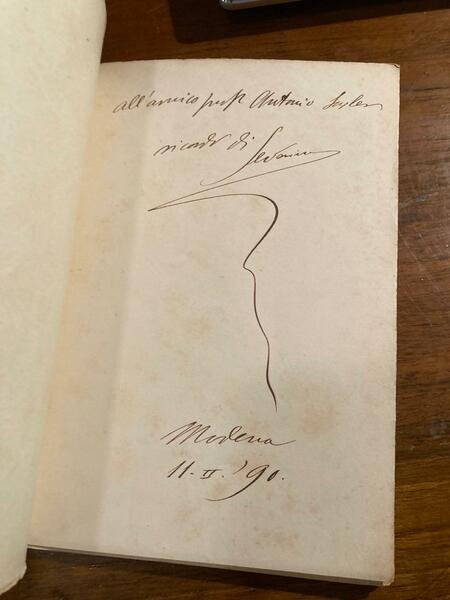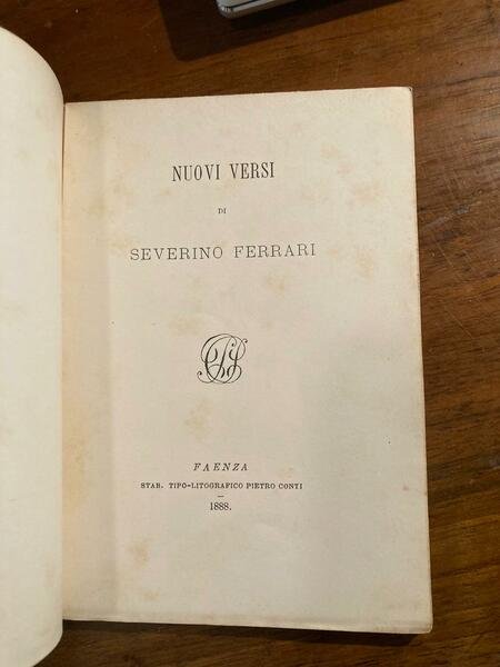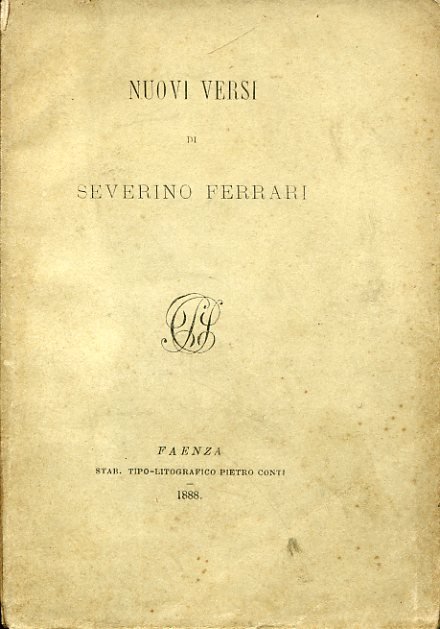 In-16° (168x118mm), pp. 47, brossura editoriale. Bella dedica autografa di Severino Ferrari alla prima carta bianca, datata da Modena, 11 febbraio 1890. Ottimo esemplare con qualche usuale fioritura dovuta alla carta. Edizione originale, rara, di questa raccolta di versi del discepolo prediletto di Giosue Carducci, Severino Ferrari (Alberino, Bologna,1856-Collegigliato, Pistoia, 1905). Poeta assai noto per 'Il Mago', filologo e critico letterario, il Ferrari redasse col Carducci un memorabile commento al Petrarca e fu fraterno amico di Giovanni Pascoli, che lo evoca nella celebre poesia 'Romagna' ('Sempre un villaggio, sempre una campagna / mi ride al cuore (o piange), o Severino'). Assai forte fu anche, nella poesia del Ferrari, la suggestione della lirica pascoliana, soprattutto delle 'Myricae'.