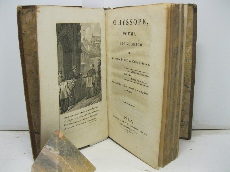 In 16, pp. XXVIII [errore di stampa, in realta' XXXVIII] + 198 + (1) di errata + (1). Tavola illustrata all'antip. Danni alle cerniere. Legatura in p. pl. coeva. Quarta edizione, la terza stampata a Parigi, curata da Timotheo Lecussan, di questo poema burlesco (ediz. originale Lisbona, 1802). Il poema ha come oggetto lo scontro che oppose il vescovo di Elvas, D. Lourenco de Lancastre, al decano D. Jose' Carlos de Lara che lo stesso Autore visse durante il periodo della sua residenza ad Elvas fra 1764 e 1774.