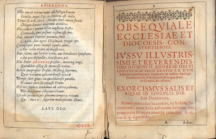 Obsequiale, sive sacerdotale Ecclesiae, et Dioecesis Constantiensis. Illustrissimi, Reverendissique Principis, ac Domini , D. Andreae, Miseratione Divina S. R. E. Tit. S. Mariae novae Diacomi, Cardinalis ab Austria, Episcopi Constantiensis, & Brixinensis, nec non Administratoris Murbacensis e Ludrensis, Domini Augiae maioris, e c. S. R. Imperij Marchionis Burgoiae, Landgrauij Nellenburgi, Domini in Feldkirch, Bregenz, e Hohenegg, anteriorum Regionu Austriae gubernatoris e c. iussu, ac mandato editum.