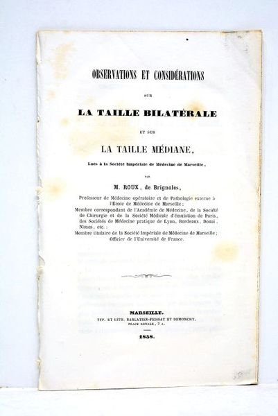 Observations et considérations sur la taille bilatérale et sur la taille médiane, lues à la Société Imperiale de Médecine de Marseille.
