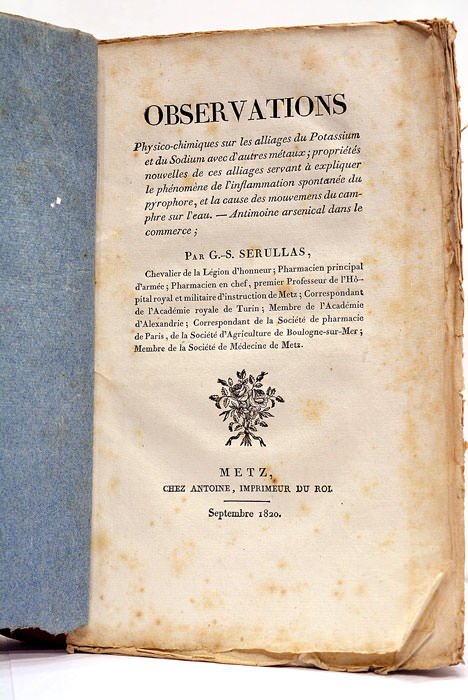 1 feuillet. 64 pages. (22x14 Cm). Broché. Couverture muette de l'époque. Recherches du chimiste et pharmacien français Georges Simon Serullas sur le potassium et ses alliages. Pharmacien major à vingt ans, attaché à l'armée d'Italie, Serullas fut professeur à Metz, à Paris et entra à l'Académie des Sciences en 1829 à la place du chimiste Vauquelin. Il venait d'être nommé professeur de chimie au Muséum quand il fut emporté par l'épidémie de choléra. On doit à Serullas d'importantes découvertes qui portent principalement sur le brome et le potassium. Serullas découvrit le protoiodure de carbone et l'iodure de cyanogène. Bel exemplaire à part quelques rousseurs.
