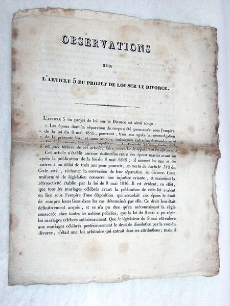 in-4. 4pp. Broché. Traces de plis. Rousseurs. Non rogné. Brochure publiée à l'occasion des débats sur le rétablissement du divorce à la chambre des députés.