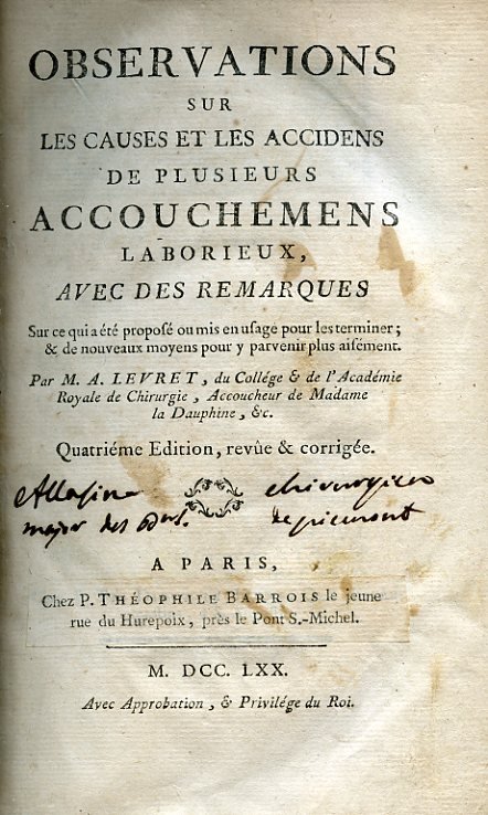 In-8° (208x128mm), pp. XVI, XXXV di prefazioni, 527, legatura coeva p. pelle marrone marmorizzata con dorso a nervetti adorno di titolo in oro su tassello, fiorellini, filetti e fregi dorati entro scomparti. Tagli rossi, risguardi marmorizzati. In fine, ripiegate, 3 tavole incise su rame con forcipi e strumenti ostetrici. Antica firma al titolo. Restauri alle cerniere. Normali bruniture. Buon esemplare. Quarta edizione, riveduta e corretta, di uno dei più importanti testi di ostetricia del secolo decimottavo, descrivgente un nuovo tipo di forcipe ideato dallo stesso Levret; 'chief contribution to obstetrics, of which there were many, was the introduction of the pelvic or maternal curve of the forceps blades' (Thoms, p. 120). Il Levret (Parigi, 1703-ivi, 1780), membro dell'Académie Royale de Chirurgie, fu 'uno dei più illustri ostetrici di tutti i tempi per i suoi studi sulla gravidanza extrauterina. Introdusse in ostetricia una serie di strumenti, alcuni dei quali, se pure in forma modificata, sono ancora in uso e perfezionò il forcipe introdotto dal barbiere Palfijn.' (Castiglioni). Blake, 270. Wellcome, III, p. 509. Cfr. Cutter & Viets, Short History of Midwifery, p. 63. Radcliffe, Milestones in Midwifery, pp. 38-41. Hagelin, Byrth of Mankynde, pp. 110-11. Thoms, pp. 120-123. O'Dowd & Philipp, History of Obstretrics and Gynecology, pp. 143-144.