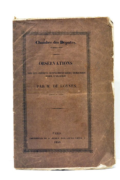 22 pages. Broché. Couverture imprimée. Patits accrocs. Trace de plis. Publié en 1840 à Paris par Henry, cet ouvrage de Loynes se penche sur les crédits supplémentaires sollicités pour l'Algérie, une question brûlante à l'époque, marquée par la colonisation française. L'auteur, en analysant les implications financières et politiques de ces demandes, offre un éclairage sur les enjeux économiques et les stratégies d'administration coloniale. Taches. Traces de plis.