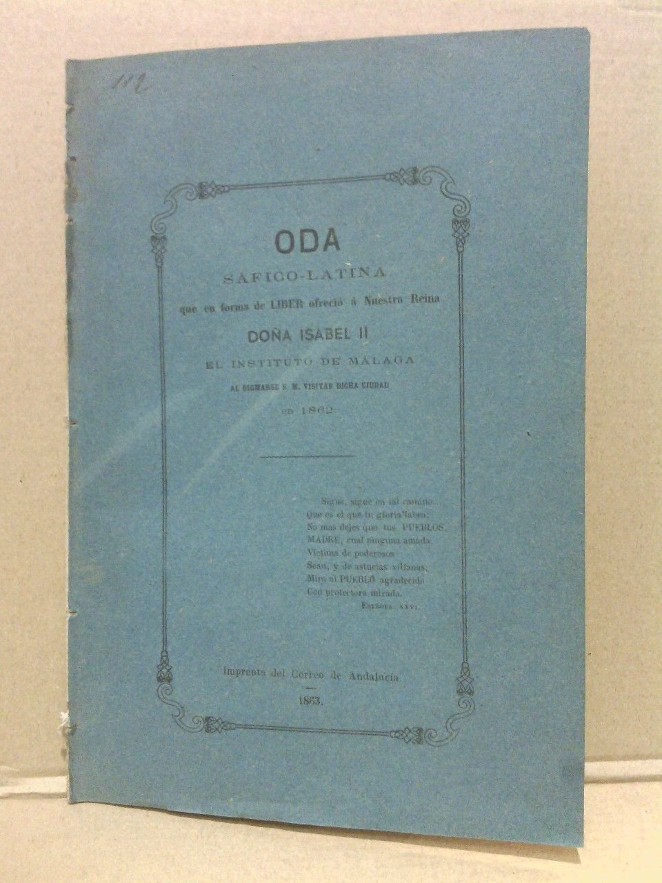 Oda sáfico-latina compuesta por el Presbítero ., Catedrático del instituto de Málaga / Con el juicio literario y la traducción en verso castellano por D. Román Biel, Catedrático del instituto de Cuenca; y el análisis crítico por el Doctor D. Mamés Esperabé Lozano, Catedrático del de Málaga