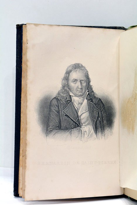 492 pages. ( 18x11 Cm). Plein-cuir. Pièce de titre au dos et illustration au premier plat dorées. Plats frottés avec salissures. Coins émoussés. Illustration représentant Bernardin de Saint-Pierre en page en regard avec la page de titre. Bien conservée grâce au papier de soie. Rousseurs importantes en gouttière ainsi qu'en premiers et derniers feuillets.