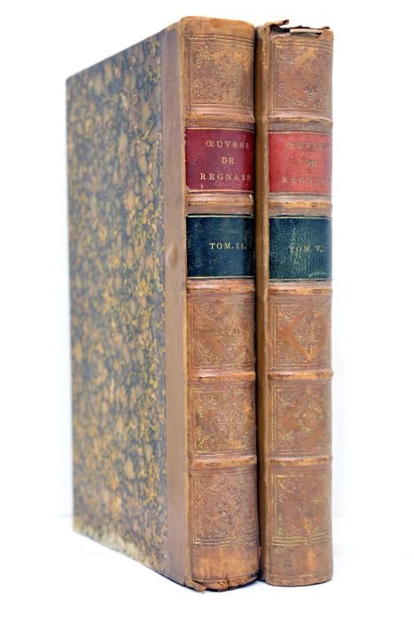 2 volumes. Tomes 2 et 6 seuls. 450 pages. + 404 pages. (21x14cm). Demi-basane marron. Dos à nerfs orné. Pièces de titre et tomaison maroquin. Gardes de papier marbré. Dos un peu frotté. Accidents aux coiffes. Charnières un peu fendues. Coins émoussés. Marges inférieures de la reliure très détériorées à cause de l'humidité (tome 2). Intérieur un peu bruni. Rousseurs sans gravité. Traces d'humidité à la marge inférieure (tome 2). Par ailleurs, bon état intérieur. Demi-basane de l'époque, présentant un dos très délicatement orné. Le tome 2 contient ces oeuvres: Attendez-moi sur l'orme, La Sérénade, Le Bal, Le joueur et Le Distrait. Le tome 6 contient ces oeuvres: Le Divorce, La Descente d'Arlequin aux enfers, Arlequin, homme à bonnes fortunes, Les Filles errantes ou Les Intrigues des Hôteleries et La Coquette ou L'Académie des Dames.