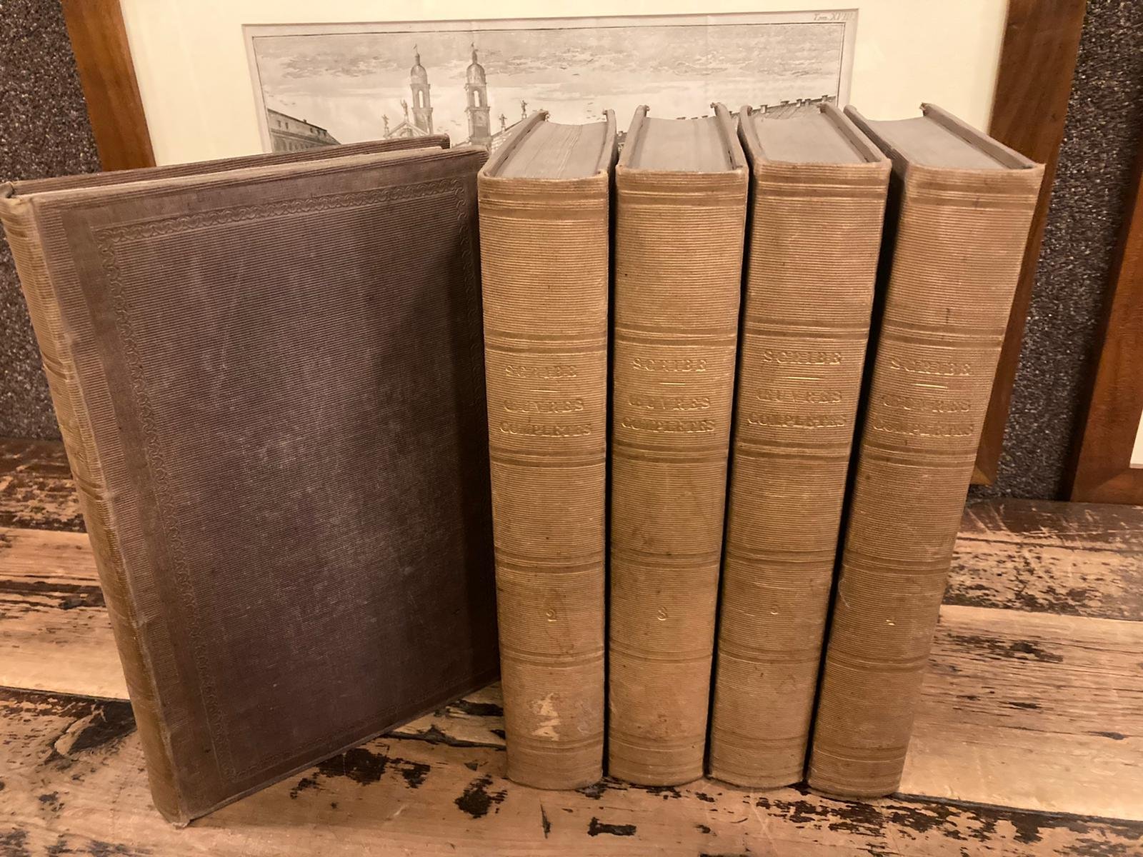 5 volumi in-4° (27x17cm), pp. (4), 632, (2); (4), 732, (4); (4), 626, (2); (4), 638, (2); (4), 693, (2); legatura del tempo t. tela con titolo in oro ai dorsi e bordura a secco lungo il perimetro dei piatti. 180 illustrazioni in taille-douce f.t. da invenzione di Alfred e Tony Johannot, Gavarni, Marckl, etc. Testo bicolonne. Ottimo esemplare. Edizione profusamente illustrata delle opere complete di Scribe, scrittore la cui fortuna fu immensa nel corso di tutto l'Ottocento e che oggi vive soprattutto come librettista di alcuni dei massimi compositori del suo secolo: Rossini e Donizetti, Verdi e Meyerbeer, Halévy e Auber, etc. Il primo vol. contiene in principio il discorso di ricevimento di Scribe all'Académie Française.