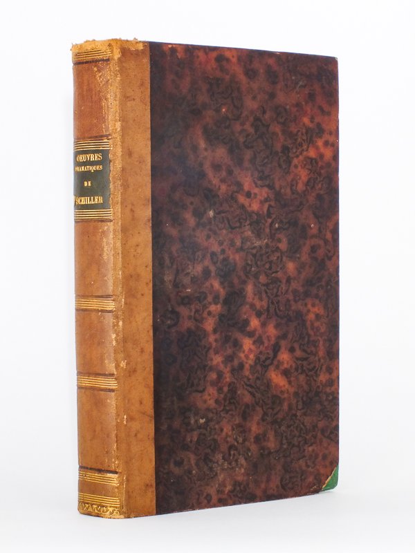 1 vol. in-8 rel. demi-basane beige, texte sur deux col., J. B. Clarey éditeur, Pari, 1837, 701 pp. Contient : Vie de Schiller ; Les Grigands ; La conjuration de Fiesque ; Intrigue et amour ; Don Carlos ; Le Misanthrope ; Wallenstein (1ère et 2e partie) ; Marie Stuart ; Guillaume Tell ; La fiancée de Messine ; La pucelle d'Orléans ; L'hommage des arts ; Plan de Warbeck ; Plan des chevaliers de Malte ; Fragments de Démétrius. Etat très satisfaisant (couv. frottée en mors et en coins, qques rouss., bon état par ailleurs, avec intérieur frais et reliure solide).