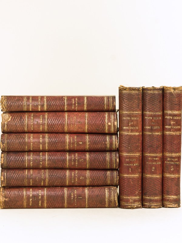 Rappel du titre complet : Oeuvres et Oeuvres Posthumes (Oeuvres Complètes en 8 Tomes - Complet) [ Détail ] Oeuvres de M. J. Chénier Revues, corrigées et augmentées, précédées d'une notice sur Chénier par M. Arnault (5 Tomes) - Oeuvres Posthumes de M. J. Chénier Revues, corrigées et augmentées et augmentées de beaucoup de morceaux inédits, précédées d'une notice sur Chénier par M. Daunou (3 Tomes) - [ On joint : ] Oeuvres anciennes d'André Chénier, revues, corrigées et mises en ordre par D. Ch. Robert Ensemble bien complet des Oeuvres de Marie-Joseph Chénier, publié chez Guillaume en 1824. On joint le volume des "Oeuvres anciennes d'André Chénier" publié chez le même éditeur. Etat moyen (plusieurs accrocs avec manque en coiffe, bon état intérieur). Prix en l'état