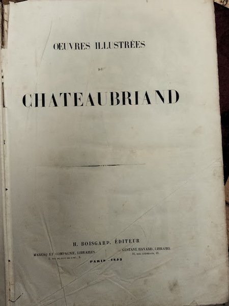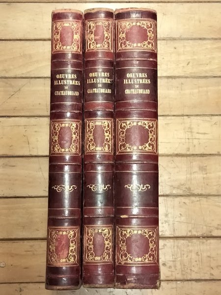 3 voll., in 4°, m. pelle. 1° voll.: Genie du christianisme, pp. 256; Les Quatre Stuarts, pp. 48; Renè, pp. 46; Atala Chactas, pp. 32; Melanges, pp. 80; Etudes historiques, pp. 192. 2° vol.: Opinions et discours, pp. 183; Revolutions anciennes, pp. 136; Mackensie, pp. 32; Les martyrs, pp. 176; Les natchez, pp. 128; Le dernier abencerage, pp. 16; Analyse raisonnee, pp. 127; Melanges politiques, pp. 192. 3° vol.: Itineraire de Paris Jerusalem, pp. 208; En Italie et en Amerique, pp. 112; Le Paradis perdu, pp. 168; Essai sur la litterature anglaise, pp. 112; Vie de Chateaubriand par M. Ancelot, pp. 120. L'opera è arricchita da numerose inc. Fioriture. Lievi gore. Due pp. del 1° vol. presentano strappo che interessa il t. ma non ne impedisce la lettura. Mende ai piatti.