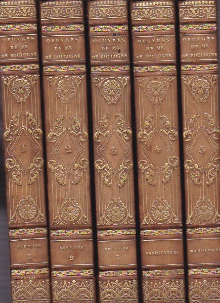 5 voll. in-8° (215x134mm), pp. (18), CXXVIII, 411, (2); VIII, 612, (2); VI, 537, (2); (2), VI, 597, (2); (6), VI, 482, (2); elegante legatura coeva p. pelle marrone con decori ornamentali impressi a freddo al centro dei piatti entro filettature dorate plurime con motivi ornamentali disposti agli angoli esterni ed interni; il tutto è a sua volta bordato da una filettatura dorata e da una bordura ornamentale a secco. Dorso con titolo, segnatura di volume e ricchi motivi ornamentali in oro. Tagli dorati, risguardi in decoro marmorizzato caillouté. Vignette incise ai frontespizi. Esemplare con sparse fioriture ma in buono stato conservativo nel complesso. Raccolta delle opere sacre del Vescovo di Troyes, Étienne Antoine Boulogne (Avignone, 1747-Troyes, 1825), uno dei più ammirati predicatori del clero francese del suo tempo. I primi tre voll. contengono i suoi sermoni, il quarto i panegirici e le orazioni funebri, il quinto i mandati e le istruzioni pastorali. Il Boulogne fu predicatore della corte di Francia e strenuo oppositore dei decreti dell'Assemble costituente sul clero di Francia, opposizione che gli valse diversi periodi di carcerazione. Cappellano di Napoleone dal 1806, dopo la messa in stato di arresto di papa Pio VII rassegnò le dimissioni, con uno strascico di rimostranze che gli costarono nuovamente il carcere. Nominato Pari di Francia durante la Restaurazione, nel 1821 pronunziò tra l'altro una celebre orazione funebre per il Duca di Berry (presente nel quaro vol. della presente raccolta). Molto attivo nel campo del giornalismo, è considerato il fondatore della stampa cattolica francese. Cfr. Rohrbacher, Histoire de l'eglise, Paris, 1825, XXVIII, 130-132; voce 'Boulogne' di Charles B. Schrantz in Catholic Encyclopaedia.