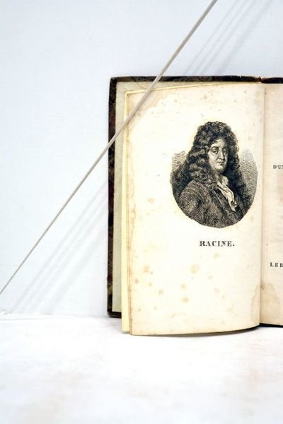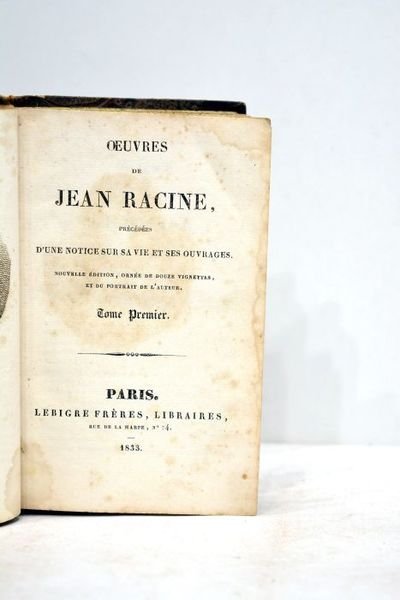238 pages. Vignettes hors-texte manquantes. (14,5x10cm). Demi-basane à coins. Plats couverts de papier marbré. Tranches jaunes. Dos lisse orné et titre en lettres dorées. Dos partiellement décollé. Manque à la coiffe inférieure. Mors supérieur fendu. Frottements sur la reliure. Rousseurs éparses à l'intérieur. Légers défauts d'usage. Manquent des illustrations hors-texte. Bon état intérieur par ailleurs. Ouvrage orné du portrait de Racine en frontispice. Les vignettes hors-texte annoncées au titre ont été coupées. Ce volume contient les suivantes pièces: Notice sur la vie et les ouvrages de Racine, La Thébaïde, Alexandre et Andromaque.