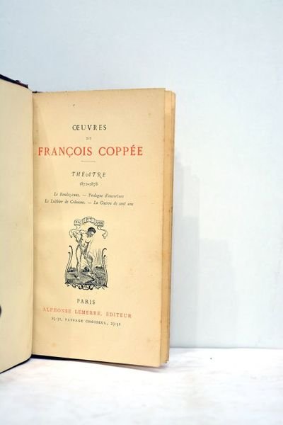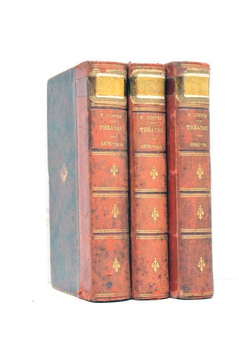 3 volumes. Tomes 1, 2 et 3 seuls. 322 pages. + 251 pages. + 314 pages. (16x10cm). Demi-basane rouge. Dos lisse orné et titré en lettres dorées. Etiquette blanche contrecollée sur la coiffe inférieure. Gardes de papier marbré. Quelques taches et épidermures sans gravité sur le dos. Frottements sur les plats et les coupes. Infimes rousseurs à l'intérieur. Très bon état intérieur. Ensemble de trois volumes particulièrement frais qui méritent une légère restauration sur la reliure. Tome 1: Théâtre 1872-1878. Le Rendez-vous; Prologue d'ouverture; Le Luthier de Crémone; et La Guerre de cent ans. Tome 2: Théâtre 1879-1881. Le Trésor; Le Bataille d'Hernani; La Maison de Molière; et Madame de Maintenon. Tome 3: Théâtre 1885-1895. Le Pater; Pour la Couronne, et L'Homme de la fortune (1875).
