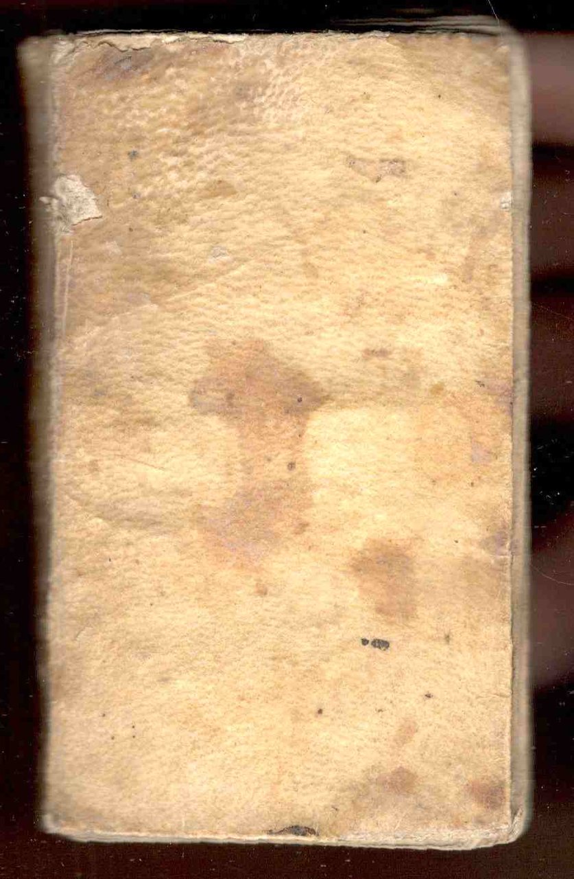 In 24° (cm 11,5 x 7), pp. 130. Pergamena semifloscia dell'epoca. Copia con gore di umido. Testo stampato in rosso e nero.