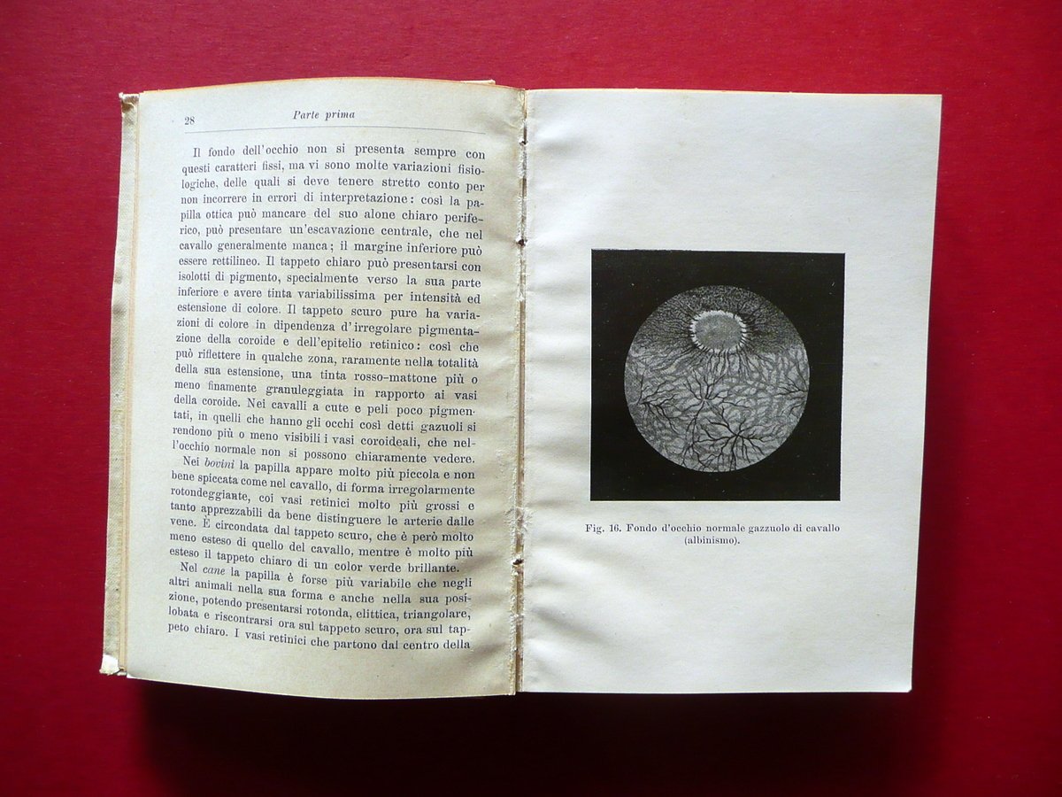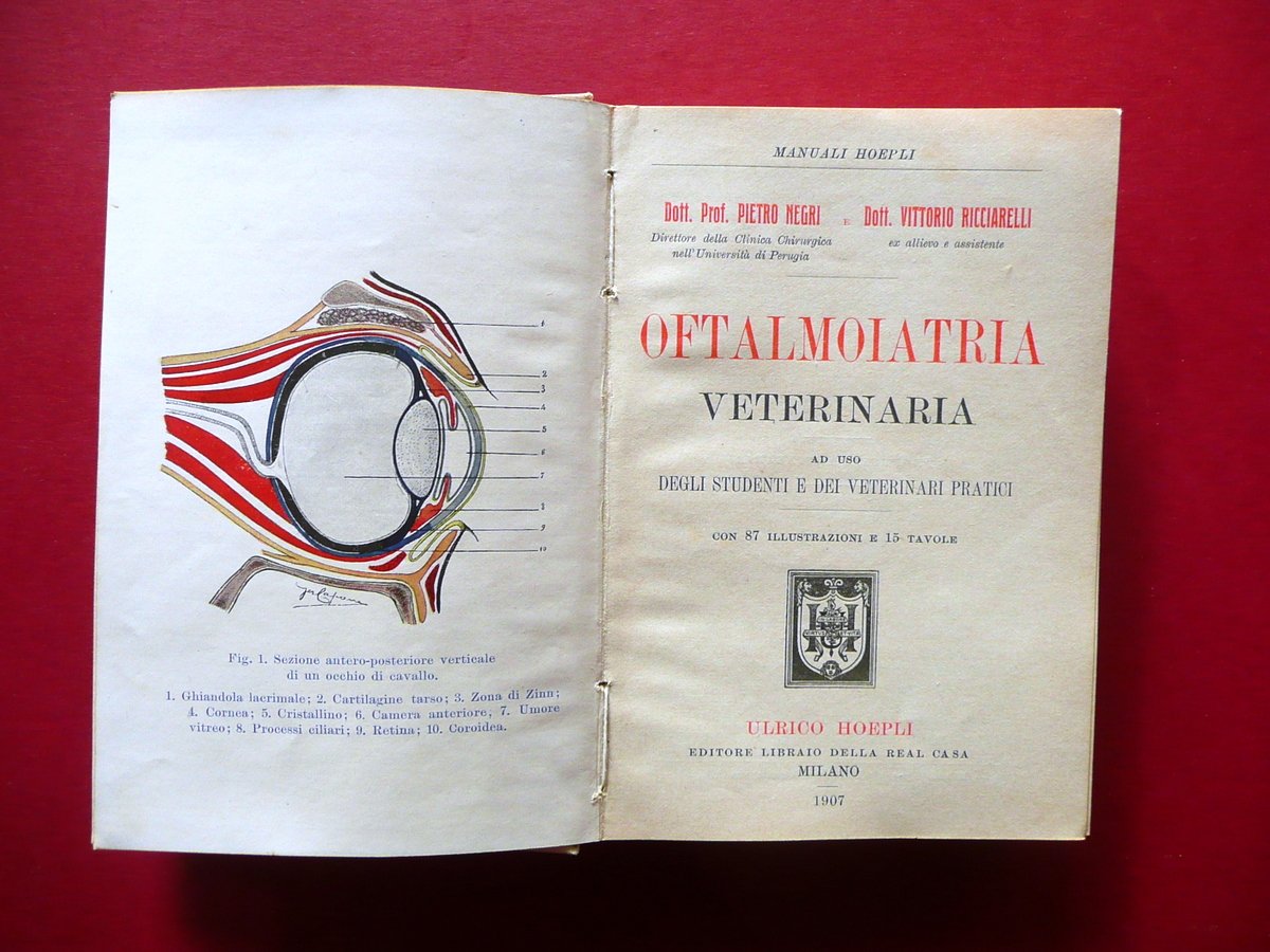 Pietro Negri - Vittorio Ricciarelli, Oftalmoiatria Veterinaria ad uso degli studenti e dei veterinari pratici con 87 illustrazioni e 15 tavole Hoepli, Milano 1907; cm 15x10,5; pp. XVI-280 con 87 fig. in b/n nel t. e 15 tavole in b/n fuori t.; tutta tela ed. Vecchio timbretto per sovrapprezzo al margine inf. del piatto ant. Condizioni di conservazione Volume ben conservato con tracce d'uso, leggermente ondulato; coperta con lievi accenni di sporco. Interni buoni; taglio ant. con una piccola macchietta di colore blu che non interessa le pagine. SETT18.L17239 N P