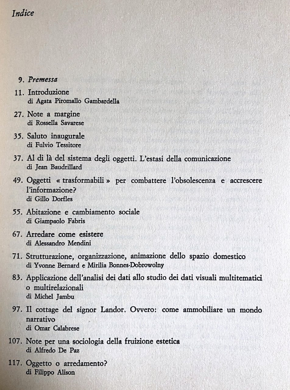 - Agata Piromallo Gambardella, Rossella Savarese, Fulvio Tessitore, Jean Baudrillard, Gillo Dorfles, Giampaolo Fabris, Alessandro Mendini, Yvonne Bernard, Mirilia Bonnes-Dobrowolny, Michel Jambu, Omar Calabrese, Alfredo De Paz, Filippo Alison, Autori Vari