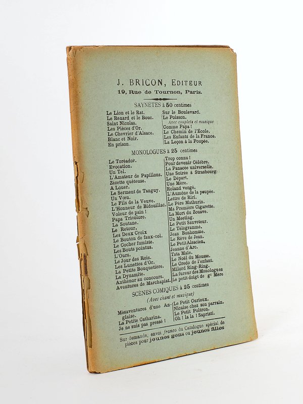 Nouvelle éd., L. Robin libraire-éditeur, Bordeaux, s.d. (1902), 64 pp. Etat très satisfaisant (jaquette publicitaire faibles et avec accrocs, très bon état intérieur) pour cet exemplaire encore non-coupé. l'éditeur L. Robin (ancienne maison P. Chaumas fondée en 1816) était un grand libraire de Bordeaux, situé au 17 rue Vital-Carles, juste à côté de l'hôtel de Nesmond, siège de l'archevêché jusqu'en 1906 et, depuis 1907, résidence des préfets de Gironde. Peu courant désormais.