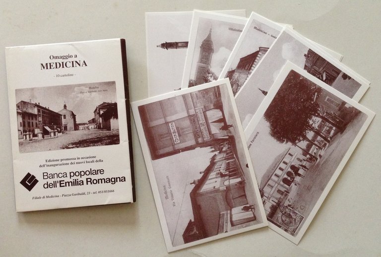 Banca Popolare dell'Emilia Romagna, Omaggio a Medicina - 10 cartoline- Banca Popolare dell'Emilia Romagna; cm 15,5x11; 10 cartoline raccolte in un astuccio ill. cartoncino ed., edizione promossa in occasione dell'inaugurazione dei nuovi locali della Banca Popolare dell'Emilia Romagna, filiale di Medicina. Condizioni di conservazione Esemplare in buono stato con leggere tracce d'uso. OPEB.4640 MT