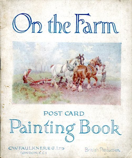 No marks or inscriptions. Tiny crease to lower corner of front cover. Contents very clean and very tight copy with very dusty unmarked boards, rusty staples and no bumping to corners. None of the uncoloured cards have been marked. 17pp. With sixteen postcards perforated for removal. Eight of the cards show a farm scene in colour and the other eight (facing) are to colour in as shown in the scene opposite. Extremely scarce.