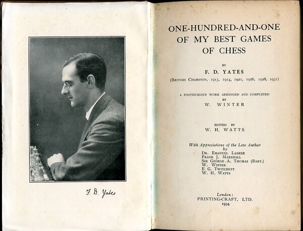 Well foxed near-end papers and a few other pages. No other marks or inscriptions. No creasing to covers or to sunned spine. Mainly clean very tight pages with dull unmarked brown cloth boards, rubbing to spine ends and very tiny bump to upper rear corner. Atractive marbled end papers. 182pp. Frederick Yates was British Chess Champion in 1913, 1914, 1921, 1926, 1928 and 1931. This is a posthumous work arranged and completed by W Winter and edited by W H Watts. First British Edition. A scarce book.