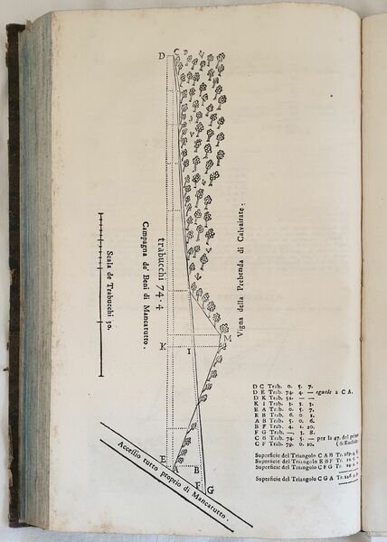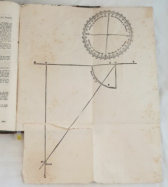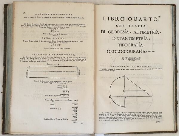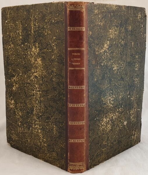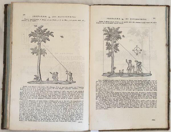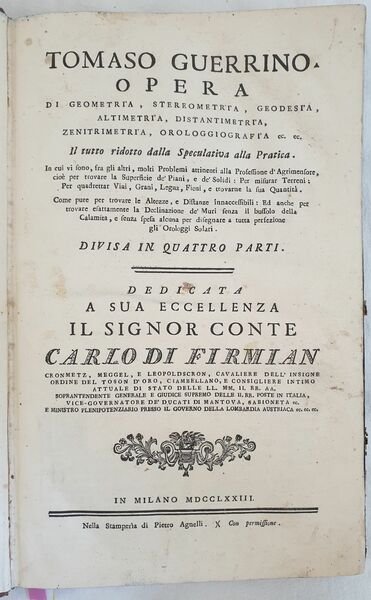 Bella edizione del 1773 di questa rara opera di geometria di Tommaso Guerrino ad uso degli agrimensori e geometri. Numerose incisioni su legno e cinque planches due delle quali ripiegate. L'opera è suddivisa in quattro parti: la prima è un trattato di geometria pratica e teorica contenente una serie di problemi ed esercizi di geometria e loro risoluzione matematica; la seconda parte Stereometria pratica ossia dei corpi solidi; terza parte che tratta delle misure dei terreni. La quarta ed ultima parte tratta di geodesia, altimetria, distantimetria, topografia e le istruzioni per disegnare gli orologi solari. In buone condizioni e completo. Copertina in mezza coeva con titolo e decorazioni in oro al dorso in buone condizioni generali con lievi usure ai margini e dorso. Legatura in buone condizioni ma qualche pagina allentata o staccata dalla legatura (pp. 275, 277, da 305 a 312) e qualche lieve rottura. Pagine in buone condizioni con rare fioriture. Strappo ad una planche ripiegata. In folio. cm 39x25. pp. (4)+336+(6) Beautiful edition of 1773 of this scarce work of geometry by Tommaso Guerrino for the usage of surveyor and geometry. Different woodcuts and five plates two of them are folded. The work is divided into four parts: the first one is a treaty of practical and theoric geometry containing a series of problems and exercises of geometry and their mathematical resolution; the second part Stereometry or solid bodies; third part about the measures of lands.The fourth and last part is about study of lands, topography and instruction to draw solar watches. In good conditions and complete. Half leather coeval with gilted title and decorations in the spine in good conditions lightly worn in the extremities. Binding in good conditions with some loose pages or detached from binding (pp. 275, 277, from 305 to 312) and some light crack. Pages in good conditions with occasional foxing. In folio. cm 39x25. pp. (4)+336+(6)