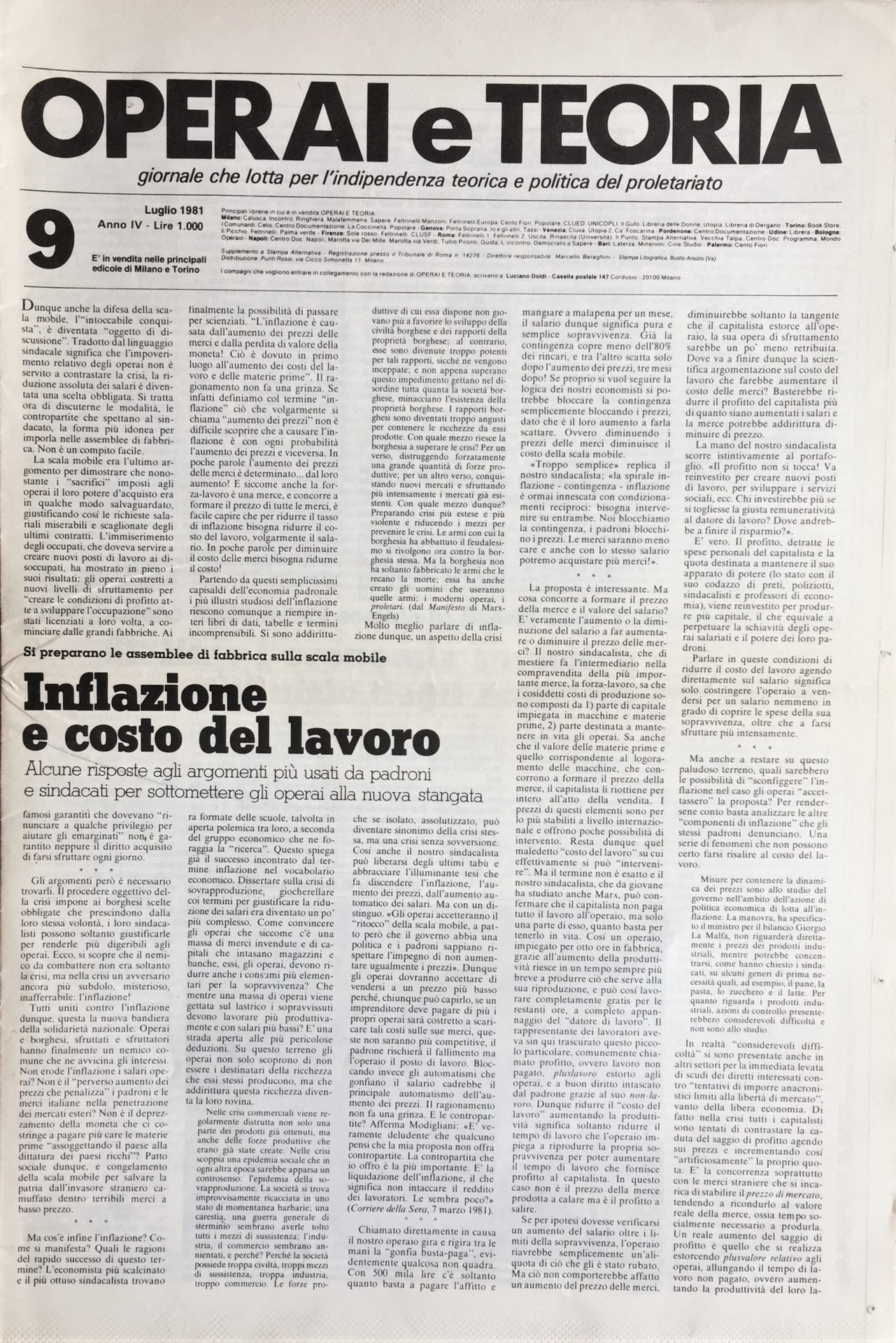 Operai e Teoria. Giornale che lotta per l'indipendenza teorica e politica del proletariato. Anno IV. No. 9. Luglio 1981