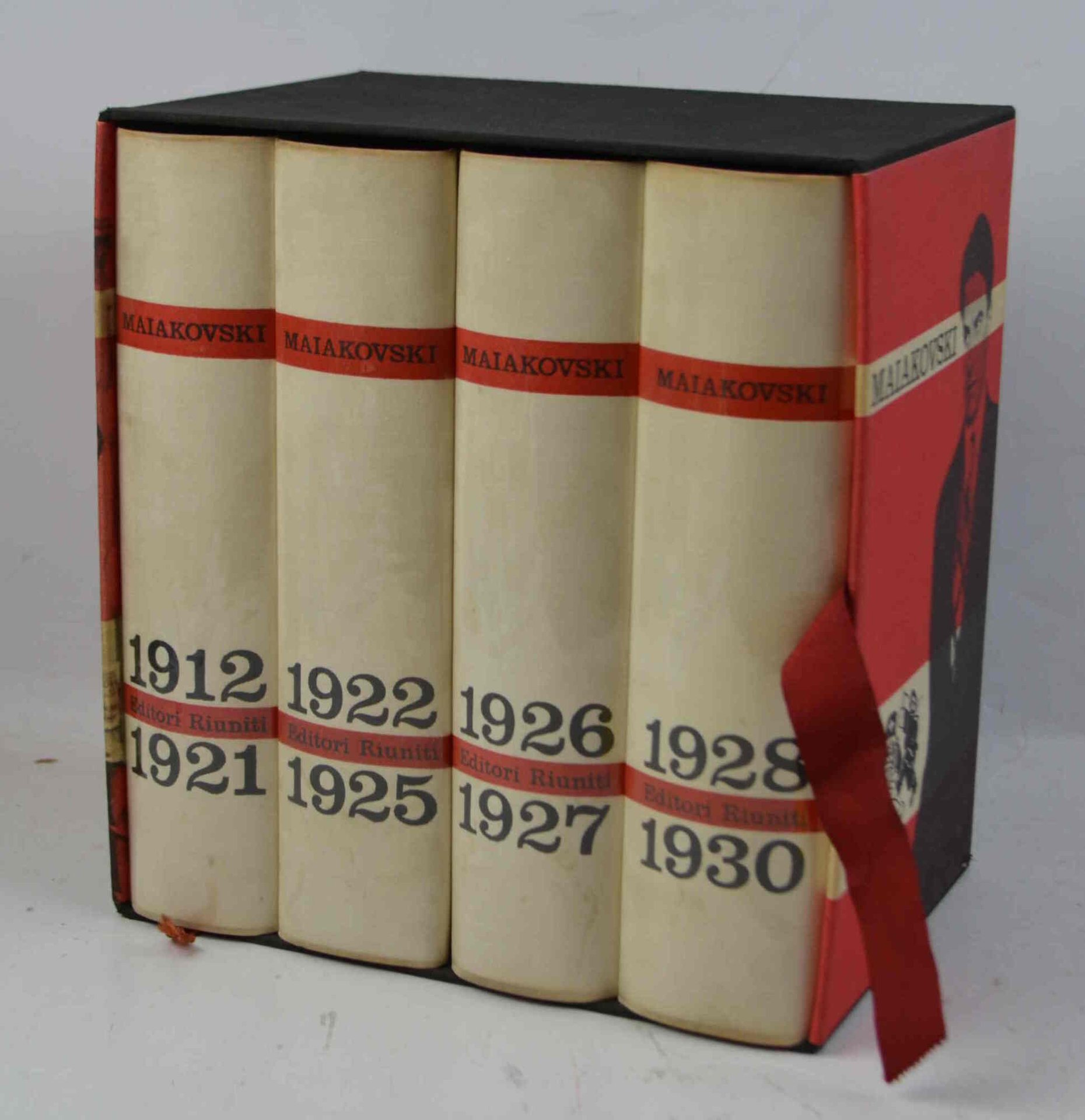 [ 22 x 15 CM. ], 4 VOLUMI nel loro cofanetto , LVIII (2) 813 (3) PP., TAVV. COL. F.T. DI VESPIGNANI; 920 (2) PP., TAVV. COL. F.T. DI VESPIGNANI; 885 (3) PP., TAVV. COL. F.T. DI VESPIGNANI; 983 (3) PP., TAVV. COL. F.T. DI VESPIGNANI, 24 TAVV. (FOTOGRAFIE, DISEGNI, MANIFESTI, BOZZETTI) B.N. E COL. F.T. DI DOCUMENTAZIONE SULLA VITA DEL POETA; LEG. IN T. TELA EDIT. BIANCA, COP. ILL. DA DISEGNO ROSSO E NERO DI MAIAKOVSKI, TRATTO DAL BOZZETTO PER MISTERO BUFFO, IMPRESSO AL P. ANT. (DORSO LEGG. BRUNITO), SCRITTE ROSSE E NERE IMPRESSE AL P. ANT. E AL DORSO, SOVR. IN ACETATO TRASPARENTE, NASTRINO SEGNALIBRO, COFANETTO IN CART. EDIT. ILL. COL. (LIEVISSIME TRACCE D'USO E DI POLVERE), OTTIMO STATO (F/F). DALL'INDICE DEL VOLUME PRIMO: INTRODUZIONE CRONOLOGIA DELLA VITA E DELLE OPERE DI MAIAKOVSKI AVVERTENZA IO STESSO [AUTOBIOGRAFIA] POESIE POEMI TEATRO ARTICOLI NOTE GLOSSARIO DALL'INDICE DEL VOLUME SECONDO: POESIE POEMI PROSE NOTE GLOSSARIO DALL'INDICE DEL VOLUME TERZO: POESIE POEMI TEATRO E SCENEGGIATURE [CINEMA] ARTICOLI NOTE GLOSSARIO DALL'INDICE DEL VOLUME QUARTO: POESIE TEATRO ARTICOLI NOTE GLOSSARIO TAVOLE