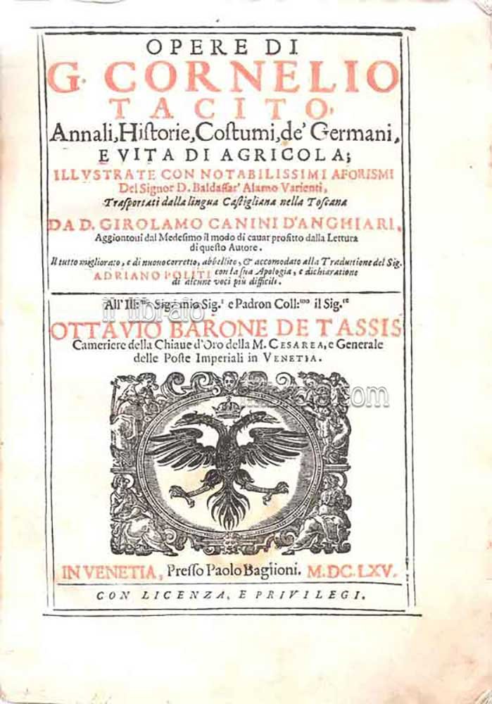 Opere: Annali, Historie, Costumi, de' Germani, vita di Agricola. illustrate con notabilissimi aforismi del signor D. Baldassar' Alamo Varienti. Trasportati dalla lingua Castigliana nella Toscana da D. Girolamo Canini d'Anghiari…