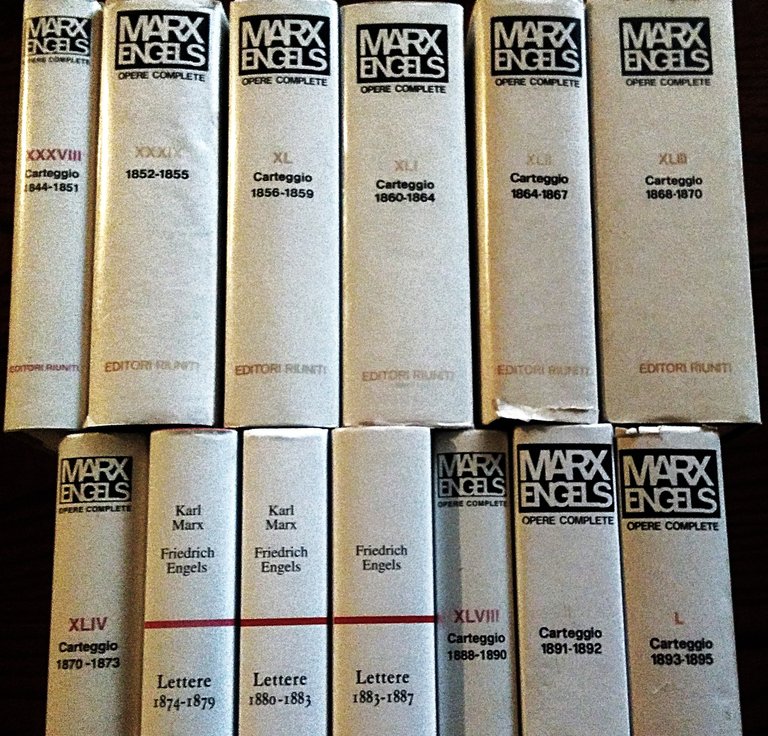 Roma, Editori Riuniti, Lotta Comunista, 1972-2009. 8°, 13 volumi, legature editoriali, sovracoperte. Vol. XXXVIII, 1844-1851, pp. VIII, 734; Vol. XXXIX, 1852-1855, pp. (4), 845; Vol. XL, 1856-1859, pp. (6), 829; vol. XLI, 1860-1864, pp. VIII, 881; Vol. XLII, 1864-1867, pp. VI, 809; Vol. XLlII, 1868-1870, pp. VIII, 949; Vol. XLIV, 1870-1873, pp. VIII, 846; Vol. (XLV), 1874-1879, pp. XX, 552; Vol. (XLVI), 1880-1883, pp. XXII, 534; Vol. (XLVII), 1883-1887, pp. XXVI, 729; Vol. XLVIII, 1888-1890, pp. VIII, 684; Vol. IL, 1891-1892, pp. VI, 714; Vol. L, 1893-1895, pp. VIII, 692. Piccoli difetti ad alcune sovracoperte, margine esterno alto di una quindicina di pagine del volume XLIV stropicciate, bella copia.