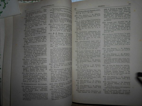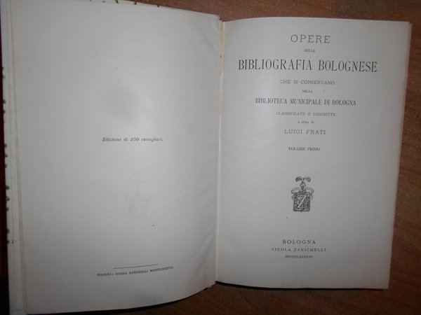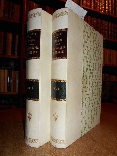 Luigi, Frati. Bologna, Nicola Zanichelli, 1889. OPERE della Bibliografia Bolognese che si conservano nella Biblioteca Municipale di Bologna. Classificate e descritte. 2 volumi in-8°, m. pergamena con grani angoli, fregi e titoli in oro ai dorsi. XII-1730. Testo e numerazione su due colonne. Bell' esemplare della rara edizione originale, stampata in soli 250 esemplari, della più nota bibliografia di riferimento su Bologna, con 12627 voci. Indici finali degli autori e delle materie. Uff. E - IV - 5