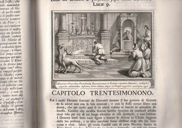 2 voll. in fol., p. perg. , pp. XXVIII + 344 (1° vol. ) - cc. nn. 2 + pp. 611 (2° vol. ) + 110 ill. (circa) sulla vita del Santo. Antip. fig.Tracce di antichi forellini che in alcuni casi ledono il testo,taglio al lembo inf. della pag.75