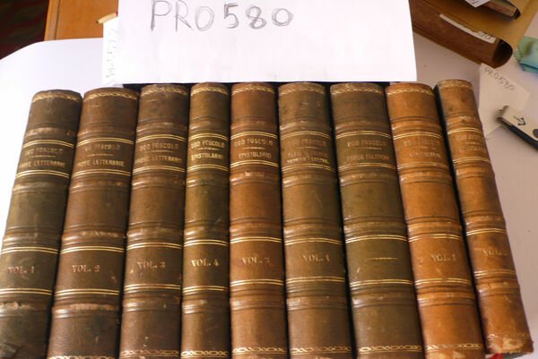 9 volumi su 12, mancano i seguenti volumi: parte 4 Poesie vol. nono, il secondo volume dei saggi di critica storico letteraria e l'ultimo volume di appendice. Ritratto del Foscolo in acciaio in antiporta del primo volume. Uno dei volumi delle prose letterarie reca sul dorso titolo errato per evidente errore da parte del legatore - DETTAGLIO DELLE CONDIZIONI : buone condizioni generali con poche fioriture - .