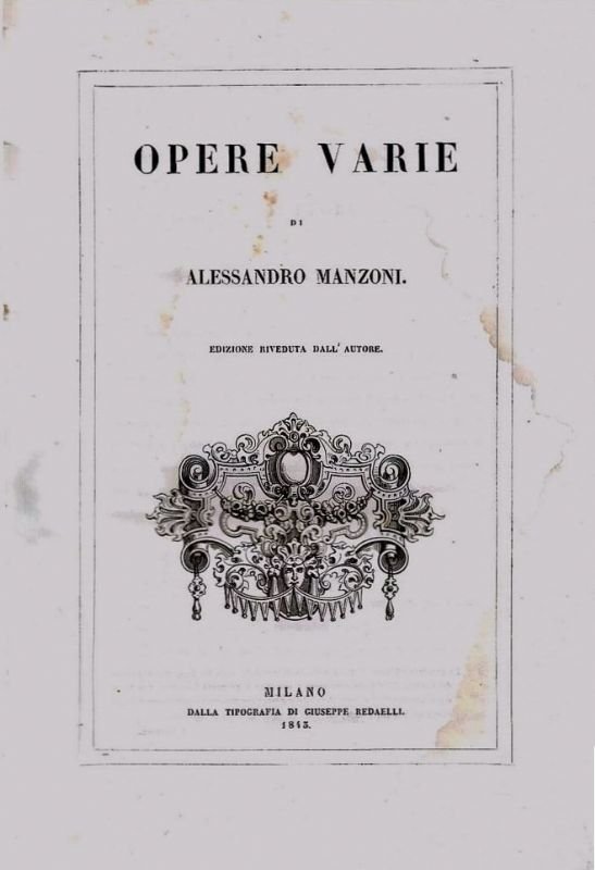 In-8° grande, cm. 27x19, legatura rifatta in mezza pelle con tassello e titolo in oro al dorso, pp. 864. Traccia di gora a scemare fino a pagina 90 e alcune fioriture sparse. Opera voluta dal Manzoni, quale completamento con i Promessi Sposi del 1840, pubblicata in 8 dispense. Nel 1860 venne pubblicata un ultima dispensa che portava da pag. 864 a 878. Nell'opera vi sono 10 silografie alle Tragedie incise dal Ratti su disegni di Focosi, altre testate incise dal Ratti e Salvioni.