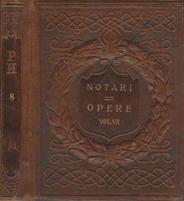 Opera incompleta composta da un volume (il VII) numero "8" della collana "ph". Graziosa coperta a tutta pelle coeva, originale con impressioni a secco al piatto anteriore e al dorso e titoli oro agli stessi. La copertina presenta segni di usura ai margini con conseguenti, lievi, tracce di decolorazione agli stessi e piega della pelle effettuata al momento della rilegatura al piatto anteriore. Pagine fruibili anche se brunite. Da segnalare legatura leggermente lenta alla cerniera delle pagine; i fogli rimangono comunque saldi; non ci sono pagine mancanti o risultanti inserto sciolto. Numero pagine 302.