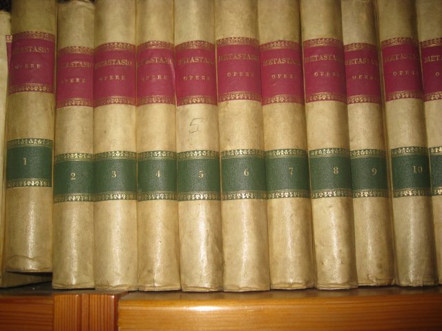 16 voll. in-4° (259x172mm), pp. 350 ca. per ciascun volume, solida legatura ottocentesca m. pergamena e angoli con titolo e segnatura di volume su due tasselli in tela (uno rosso e uno verde) ai dorsi. Ritratto del Metastasio inciso su acciaio da Scotto da invenzione di Steiner all'antiporta del primo vol. Dedicatorie a stampa variate per ogni volume. Normali fioriture, qualche sporadico alone. Esemplare assai bello.Ex-libris nobiliare di Nicolò Papadopoli Aldobrandini (Venezia, 1841-Roma, 1922) e del di lui fratello Angelo inciso da Stern (stemma coronato e sole raggiante sopra una fenice con ali spiegate; cfr. Bragaglia, 2290 e Gelli, 544). Edizione non comune delle opere complete del massimo poeta dell'Arcadia, la cui opera ebbe influenza immensa sul melodramma europeo. Le prime LX pp. in nn. romani del primo vol. contengono un'anonima biografia del Metastasio.