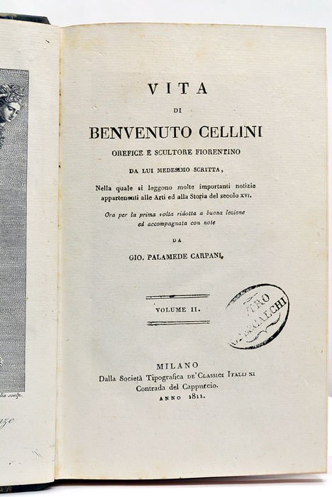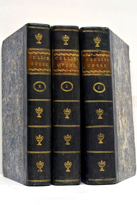 3 volumes. portrait. XXXVIII. 465 pages. 1 feuillet. + frontispice. XLVI. (1 feuillet blanc). 502 pages. 1 feuillet. + LX. 417 pages. 1 feuillet. (20x13 Cm). Demi-maroquin vert à grain long à coins. Dos lisse orné, pièces de titre en maroquin havane. Coins et coiffes légèrement émoussés. Dos un peu frottés. Les deux premiers volumes contiennent la biographie de Cellini, érudit et protecteur des arts, écrite par lui-même avec des notes de Gio. Palamede Carpani, bibliothécaire. Le troisième volume contient notamment ses œuvres sur l'orfèvrerie et la sculpture. Bel exemplaire provenant de la bibliothèque du Prince Pietro Odelscachi, avec son ex-libris manuscrit et son cachet humide dans chaque volume. Traces de plis. Quelques taches et rousseurs, sinon en bon état.