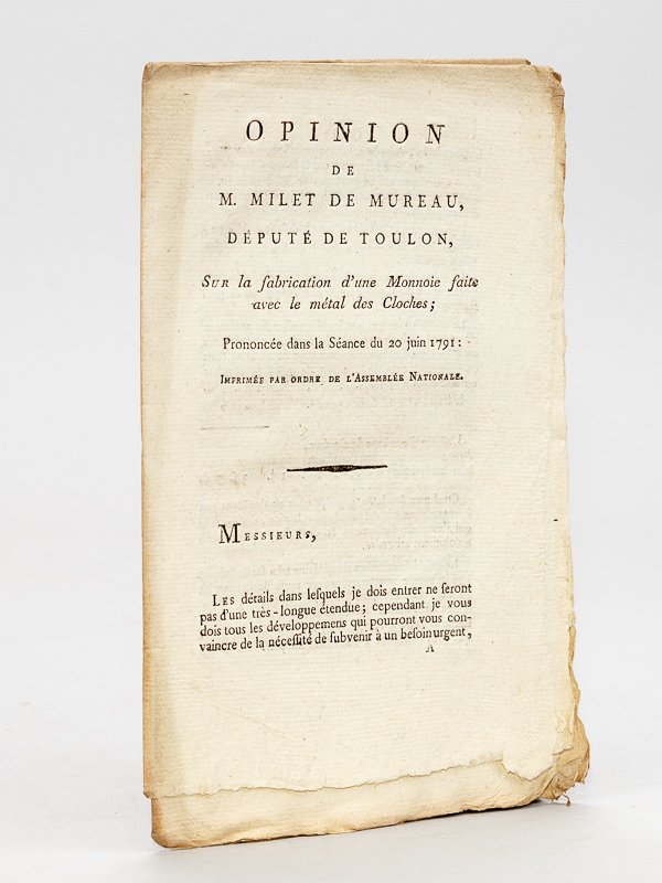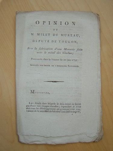 Opinion de M. Milet de Mureau, Député de Toulon, sur la Fabrication d'une Monnoie faite avec le métal des Cloches ; prononcée dans la Séance du 20 juin 1791 ; Imprimé par ordre de la Convention Nationale, 1 brochure in-8, De l'Imprimerie Nationale, Paris, s.d. (1791), 16 pp. Edition originale. Bon exemplaire.