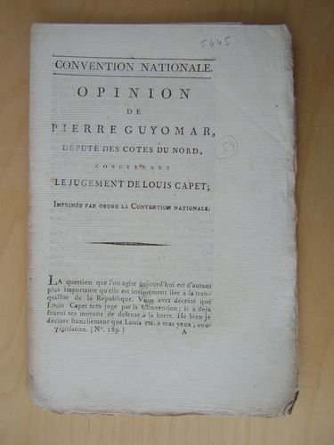 Imprimées par ordre de la Convention Nationale, 1 brochure in-8 en feuilles, De l'Imprimerie Nationale, Paris, s.d. 12 pp. Bon état. Martin & Walter, 16217. Pierre Guyomar avait été négociant en drap. De 1790 à 1792, il fut maire de Guingamp, avant d'être élu député à la Convention. Il vota contre la mort du roi.
